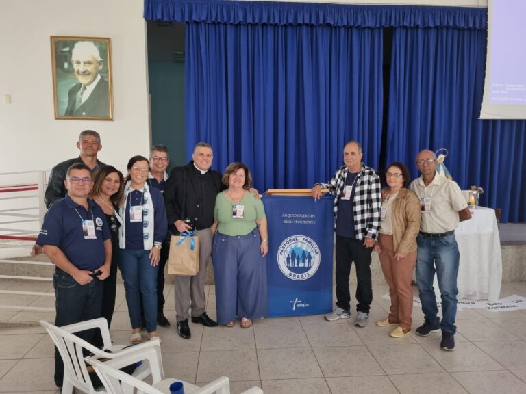 Com o tema “Família Peregrina da Esperança”, inspirado pelo Papa Francisco neste Ano Jubilar de 2025, os representantes da Diocese — Lia e Carlos Dias, Marcial e Cláudia Campolina, Marcelo e Maria Firmo, Udson e Andréa Costa, e o padre Anailton Viveiros (Assessor Eclesial da Comissão Vida e Família) — puderam, juntamente com os demais representantes, sacerdotes e leigos das (arqui)dioceses de Belo Horizonte, Divinópolis, Luz e Oliveira, refletir sobre como a família, em sua jornada terrena, deve ser um sinal visível do amor de Deus irradiando a vida e acolhimento, unida pela fé, superando dificuldades e compartilhando a esperança.