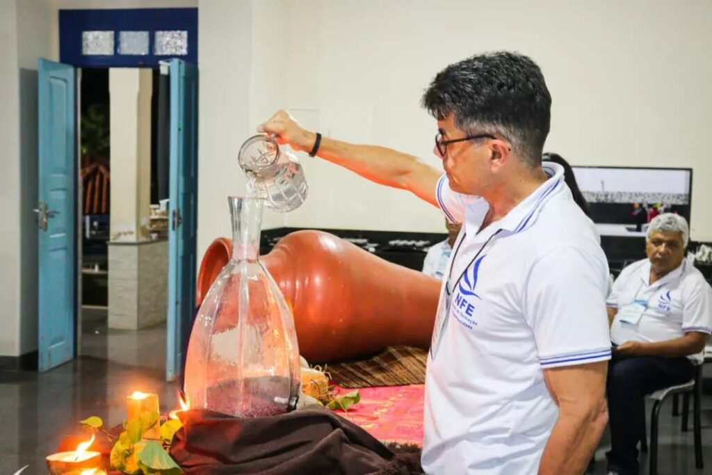 Já na noite de sábado (24), o Núcleo de Formação e Espiritualidade (NFE) preparou uma ornamentação e encenação que remete ao cenário narrado por São João no Evangelho das Bodas de Caná (Jo 2, 1-11), quando Jesus Cristo transformou água em vinho.