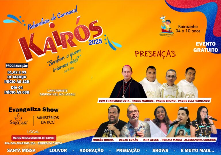 Neste ano, o Kairós completa sua 30º edição e traz o tema baseado no trecho do evangelho de São João: “Senhor, a quem iríamos nós?” (Jo 6, 68a), com a proposta de trabalhar a vida em comunidade, de acordo com os direcionamentos da RCC nacional. Com entrada franca, o encontro conta ainda com um espaço de evangelização para as crianças de 4 a 10 anos de idade. Para a presidente do Conselho Diocesano, Alessandra Cristine Coelho de Barros, serão “momentos de alegria, de festa, em que nós podemos dançar e pular na presença de Jesus”.